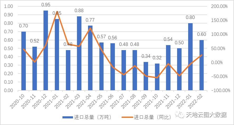图3:2020年10月-2022年2月中药材进口总量(数据来源:中国海关)