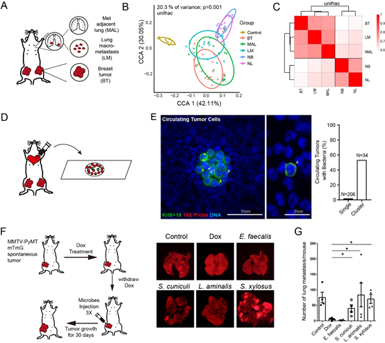 研究设法收集了在外周血中的肿瘤菌群,当这些细菌回输到肿瘤小鼠体内后,肿瘤原位的生长过程几乎没有影响,但是肿瘤转移水平开始显著增加,甚至很少发生转移的肿瘤类型也会开始出现大量转移。