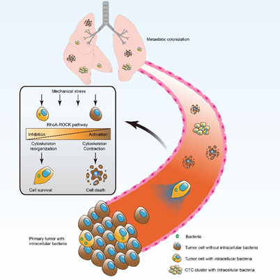 他们观察到,当癌细胞在循环系统中到处游荡时,这些细菌也会随之一同在身体各处穿行。这些细菌似乎能够调节细胞的肌动蛋白网络,并且帮助癌细胞迁移过程中应对机械性压力,提高存活率。