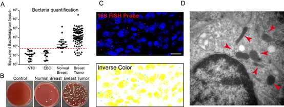 在新研究中,蔡尚博士和同事构建了一批乳腺癌模型小鼠,这些癌细胞组织充满了大量细菌,有点类似于人类乳腺癌中观察的现象。直观来看,乳腺癌组织中的细菌数量大约为正常乳腺组织中的10倍。