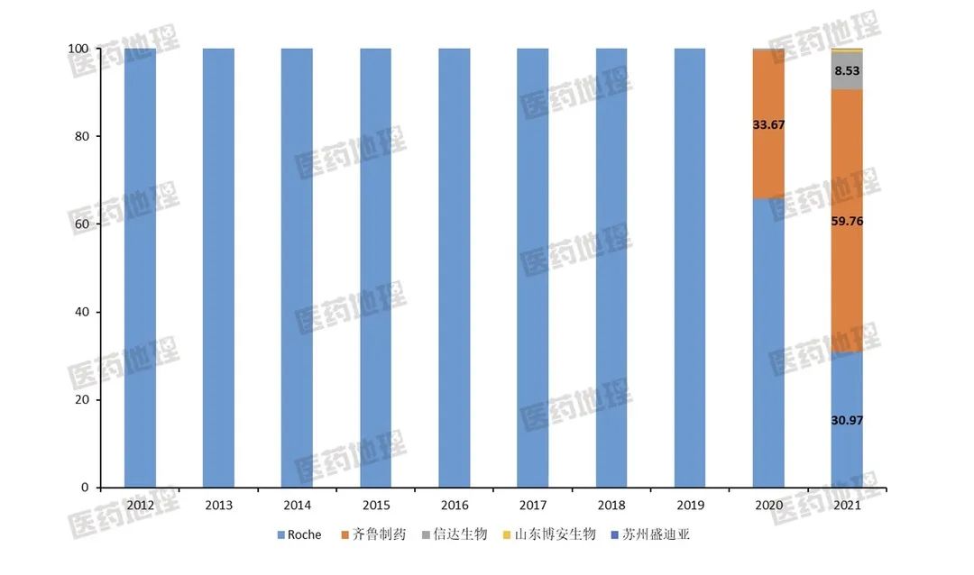 2019年12月,齐鲁制药的贝伐珠单抗注射液以1266元/支正式进行挂网销售,较贝伐珠单抗原研最新中标价降幅约35%。凭借价格优势和强大的营销能力,2020年齐鲁制药一举抢占34%的院内市场份额,2021年进一步扩大至60%。相比之下,贝伐珠单抗原研市场份额由2019年的100%下降至2021年的31%,占比不到1/3。