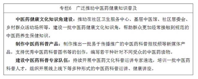 16.广泛推动中医药健康知识普及。所有县级区域依托县级医院设置中医健康宣教基地,将中医药科普知识和《中国公民中医养生保健素养》作为健康教育重要内容加以推广。充分利用网络化、智能化、数字化等方式,扩大中医药优质科普内容的覆盖面。在社区卫生服务中心、乡镇卫生院、社区居委会、乡村群众活动场所等,建设中医药健康文化知识角。鼓励支持优秀中医药科普图书、展览、新媒体产品等的创作。推动基层医疗机构通过电子屏、海报、宣传栏等经常性展示科普内容,开展健康讲座等科普活动。加强中医药科普专家队伍建设,鼓励中医药医务人员、科研人员面向社会开展科普服务。