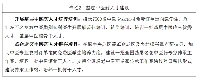 4.扩大基层中医药人才有效供给。根据需求合理确定本科层次中医专业农村订单定向免费医学生培养规模,持续开展中医类别全科医生规范化培训、助理全科医生培训、转岗培训等,鼓励开展专科层次农村订单定向免费医学生培养,为基层培养一批高素质中医药人才。开展基层西医学习中医人才培养和培训,鼓励西学中人员开展中医药服务。对现有基层中医药人员通过岗位培训、外出进修、跟师学习等方式,提高岗位技能和服务能力。鼓励退休中医医师和中医医术确有专长医师到基层执业服务。