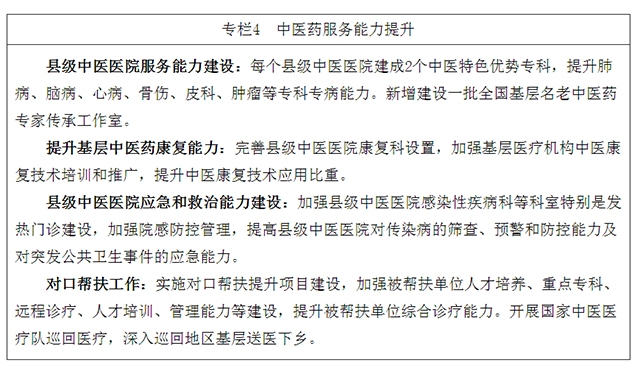 9.加强县级医疗机构中医医疗服务能力建设。开展县级中医医院“两专科一中心”建设,即每个县级中医医院建成2个中医特色优势专科和1个县域中医药适宜技术推广中心。加强县级中医医院临床薄弱专科、医技科室建设,提高医院综合服务能力。加强基层名老中医药专家传承工作室建设,培养基层中医药人才。提升基层中医医疗机构传染病防治能力,县级中医医院设置符合规范的发热门诊,具备规范的预检分诊能力。加强县级中医医院基层指导科建设,负责全县中医药技术指导和业务培训。推进中西医协同诊疗服务,提升综合医院、妇幼保健机构中医药综合服务能力和专科诊疗能力。到2025年,全部县级中医医院达到《县级中医医院医疗服务能力基本标准》。