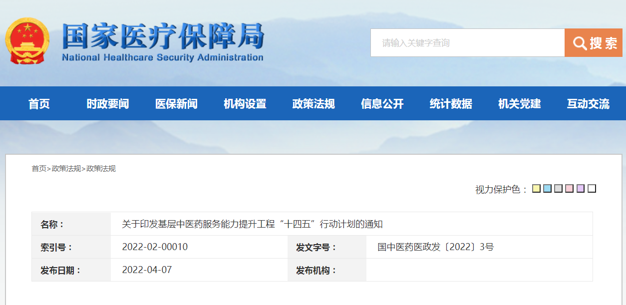 4月7日,国家医保局官网显示,国家中医药局、国家卫健委、国家药监局等十部门联合印发《基层中医药服务能力提升工程“十四五”行动计划》。