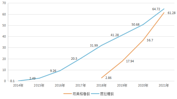 度拉糖肽和司美格鲁肽全球销售额(单位:亿美元)