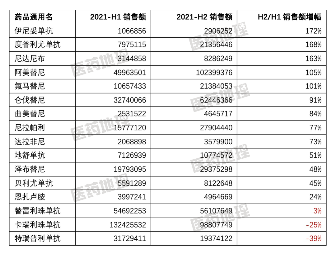 表4: 2021年上半年(H1)与下半年(H2)19个特药在样本药店的销售额(元)变化