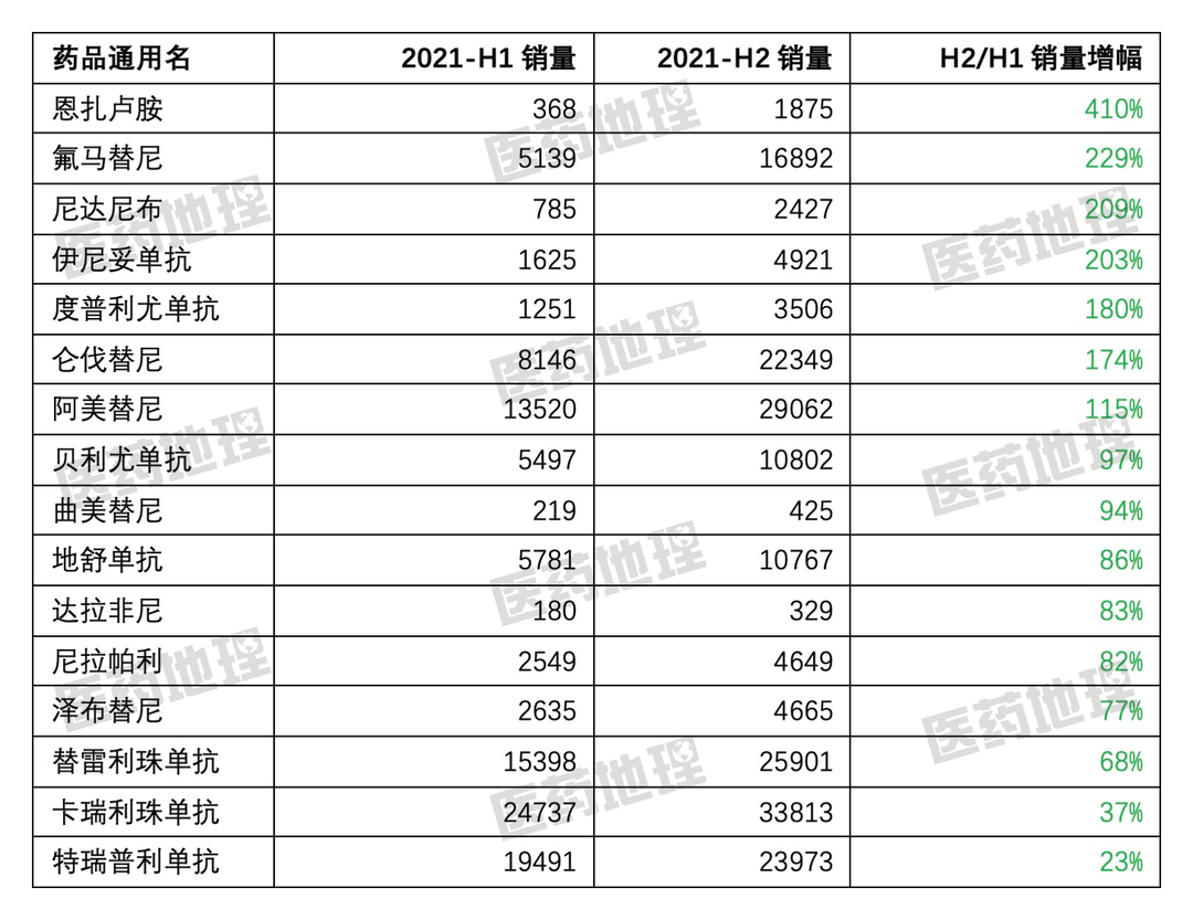 表3: 2021年上半年(H1)与下半年(H2)19个特药在样本药店的销量(最小包装单位)变化