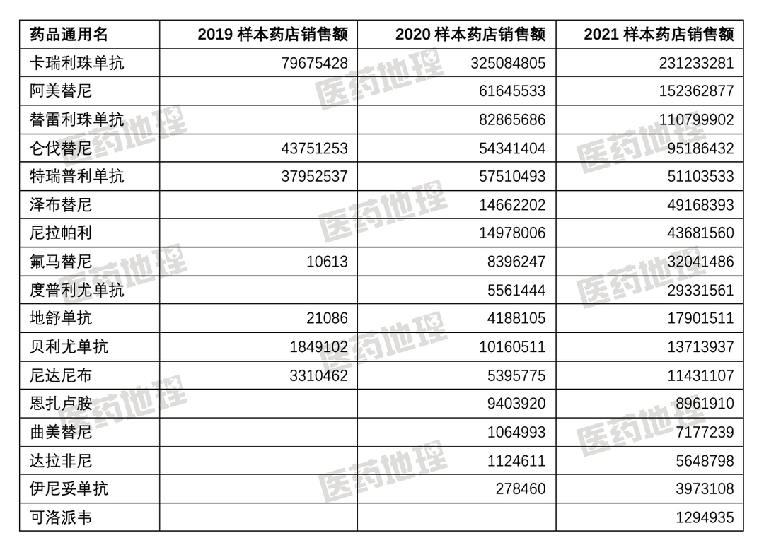 注: 丁苯那嗪(梯瓦)、依达拉奉(正大丰海)和可洛派韦(凯因格领)在2021年上半年未监测到样本药店销售数据
