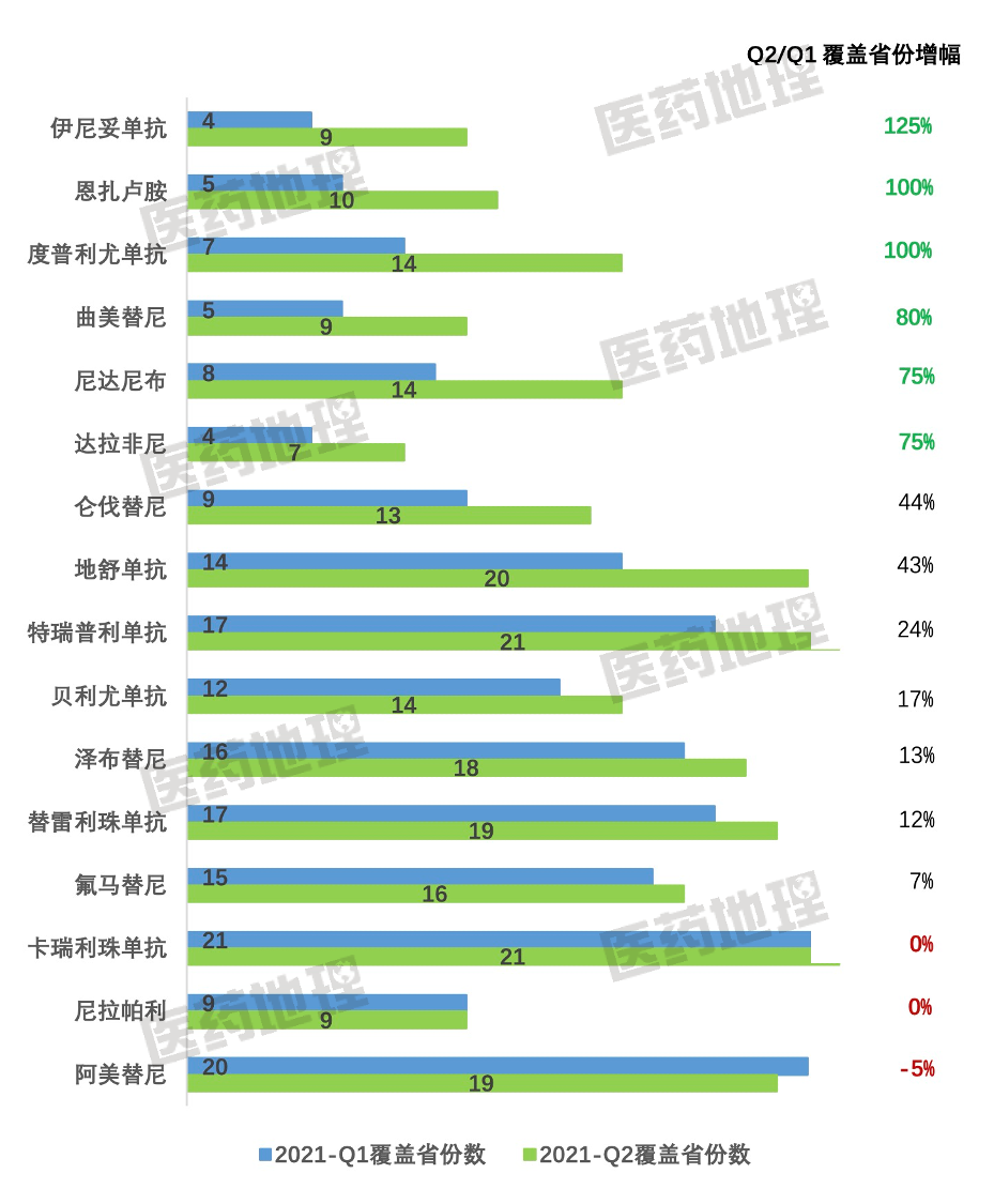 图1: 19个特药在2021年Q1与Q2监测到样本药店销售数据的省份数变化