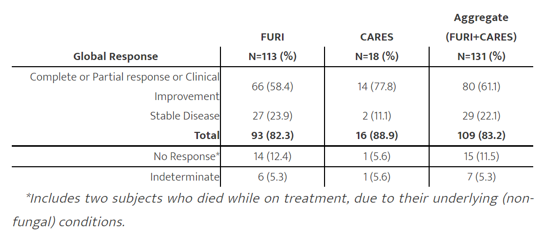 试验结果显示,两项研究包含的131名患者中,61.1%获得完全缓解、部分缓解或临床改善,22.1%患者疾病稳定(对于严重进行性真菌感染患者来说这是一个好的结果),11.5%患者未产生应答。具体数据请见下表。