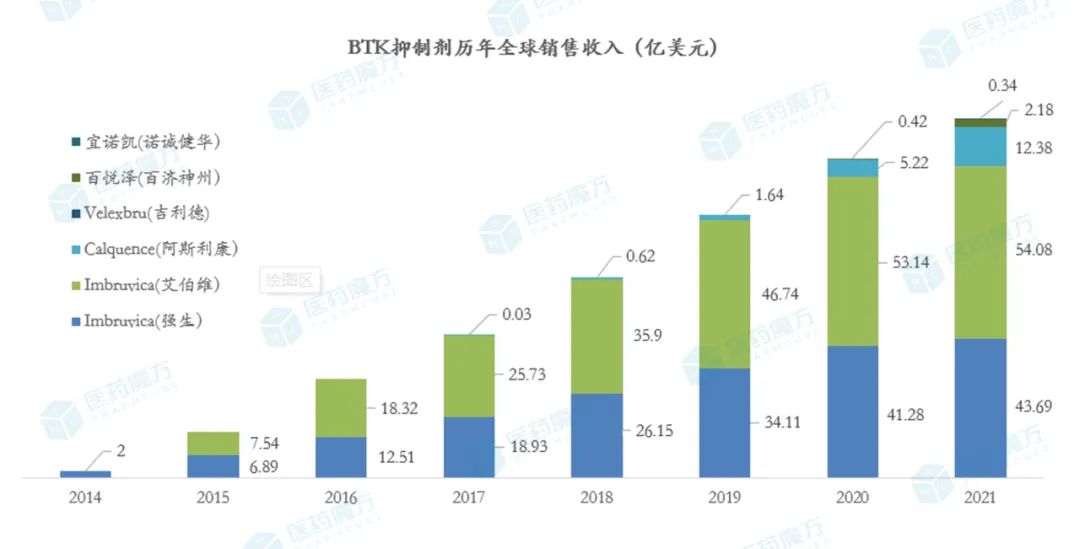 2021年,全球范围内没有新的BTK抑制剂上市,市场仍有5款产品占据,规模也是达到了110亿美元以上。不过,市场份额仍是伊布替尼一品独大,但是增长幅度和趋势已经明显放缓。