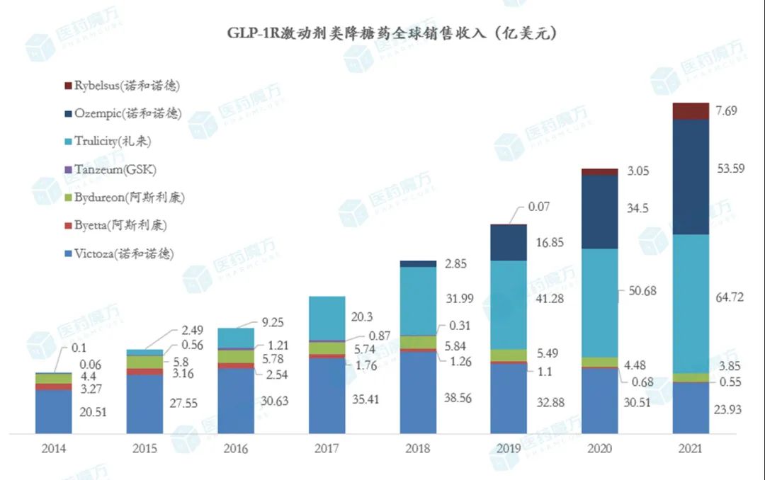 当前,全球范围内共上市8款GLP-1R激动剂类降糖药(不含复方制剂),2021年全球市场规模大约为155亿美元,主要还是被诺和诺德和礼来把控。