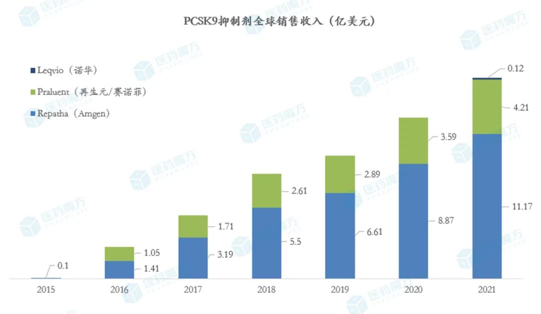 2021年,PCSK9领域的竞争格局同样没有变化,也没有新玩家进入。全球范围内上市的3款 PCSK9 抑制剂,在2021年达到了15.5亿美元的市场规模,安进Repatha市场份额占比依旧最高。