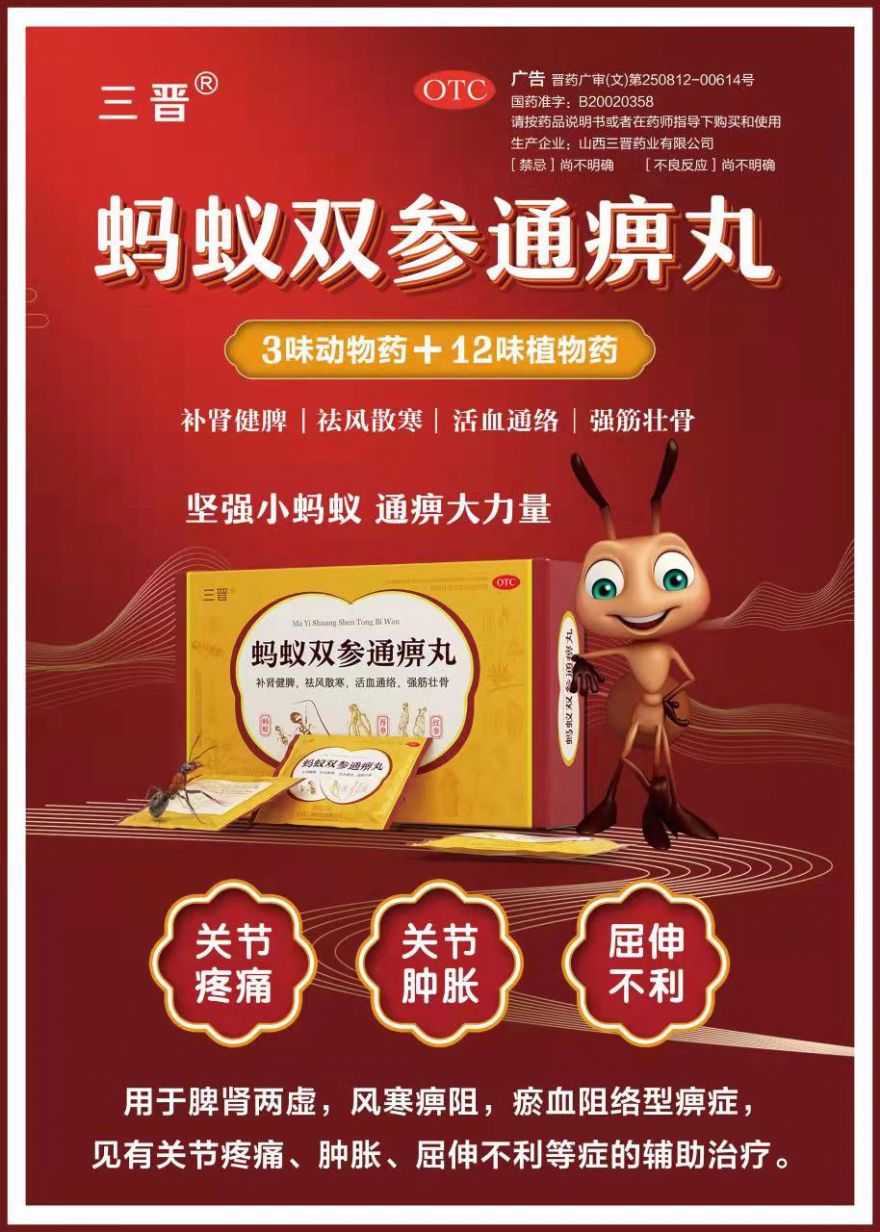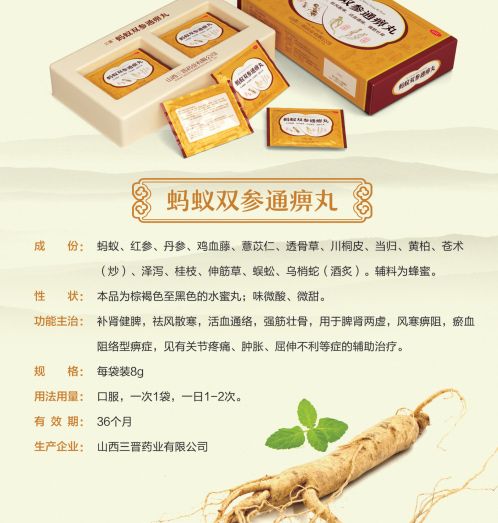 产品优势专利产品,列入国家专利配方。强效组方:同时含有动物药和植物药,三晋药业蚂蚁双参通痹丸中用的蚂蚁是棕褐沙林蚁,同时加入蜈蚣、乌梢蛇,用虫类药疏通逐邪,引药深入,深入骨缝中搜剔经络之邪。功效补肾健脾,祛风散寒,活血通络,强筋壮骨,全方位从肝肾脾入手,风寒湿同治,疏通筋络。安全长效:中药制剂,扶正固本,标本兼治。临床总有效率达到96.6%,治愈率42.3%。