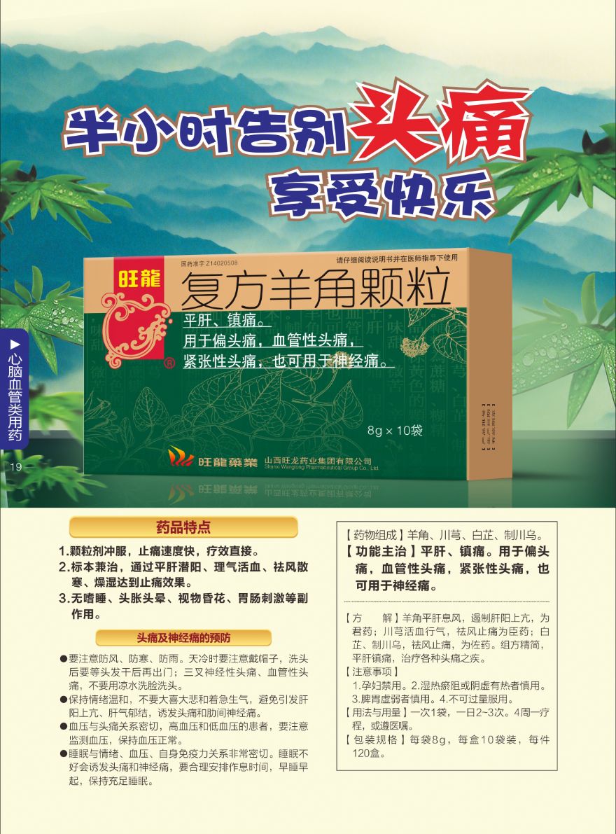 产品优势1、颗粒剂冲服,止痛速度 ,疗效直接。2、标本兼治,通过平肝潜阳、理气活血、祛风散寒、燥湿达到止痛效果。3、无嗜睡、头胀头晕、视物昏花、胃肠刺激等副作用。