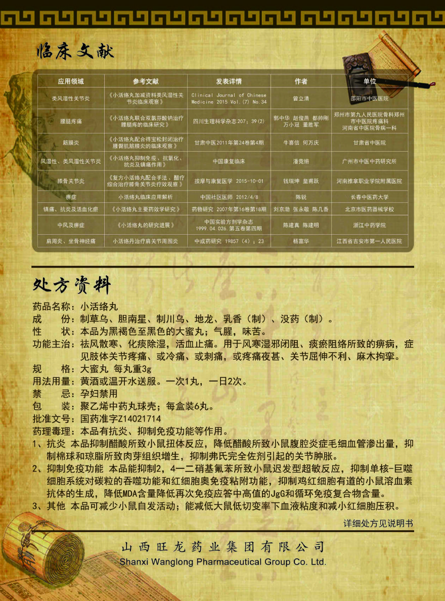 产品优势1、精选道地药材,经典名方,临床常用祛风除湿;2、方中名贵中药乳香、没药,具有明显镇痛作用,疗效确切;3、服用方便,疗效显著;4、传统剂型,做工精细,生产厂家少,市场竞争小。