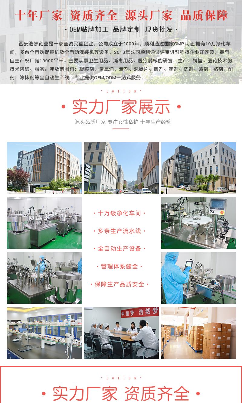 我司是一家全资民营企业,公司成立于2009年,八年生产批发代加工贴牌历史,顺利通过国家GMP认证,拥有10万净化车间,多台现代化加工生产设备,厂区面积庞大,技术先进。主要从 事保健品、卫生用品、消毒用品、疗器械的研发、生产、销售,医药技术的技术咨询、服务。涉及范围 有:凝胶剂、膏剂、泡腾片、洗剂、擦剂、滴剂、喷剂、贴剂、酊剂、涂膜剂等全自动生产线。西安浩然药业,欢迎您的加入。