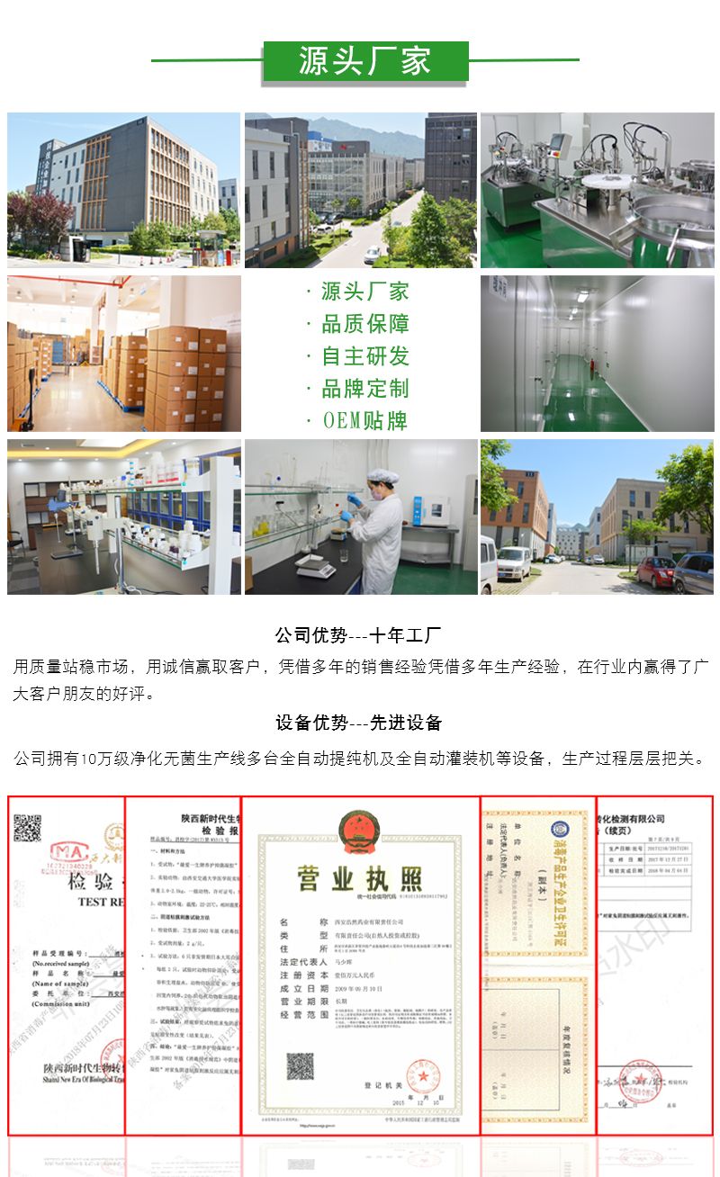 我司是一家全资民营企业,公司成立于2009年,八年生产批发代加工贴牌历史,顺利通过国家GMP认证,拥有10万净化车间,多台现代化加工生产设备,厂区面积庞大,技术先进。主要从 事保健品、卫生用品、消毒用品、疗器械的研发、生产、销售,医药技术的技术咨询、服务。涉及范围 有:凝胶剂、膏剂、泡腾片、洗剂、擦剂、滴剂、喷剂、贴剂、酊剂、涂膜剂等全自动生产线。西安浩然药业,欢迎您的加入。