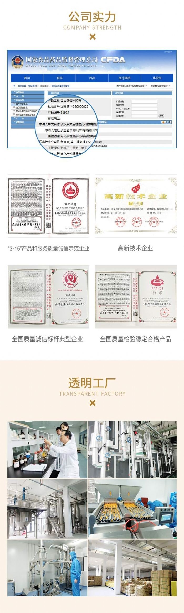 武汉名实生物医药科技有限责任公司是集研发、生产、销售为一体的大健康企业,由谈运良博士创立于2000年,位于武汉东湖新技术开发区。公司拥有11项国家专利,22年生产经验,4万平米生产基地,国际标准化工厂,九大实验室,10万级生产线。公司自成立以来,恪守"以名律己,以实惠人"的公司理念,以大众健康为己任,坚持"凝集祖国传统医学,创新现代生物技术"的技术发展思路,致力于生物技术、食品贴牌代加工的研究开发及推广事业。公司经过20多年的积累和沉淀,已经迈入了华中地区具有研发实力、发展潜力和影响力的医药公司行列。为了保证产品的质量及全国供应,2006年精心打造了全新现代化GMP达标厂房,先后通过国家保健食品GMP认证、药品GMP认证、医疗器械生产公司认证,现正在申请药品研发GLP实验室认证。2012年,投资数亿元兴建了新的生产基地,占地60余亩,将由GMP药厂、现代化办公楼、员工文化生活中心组成。名实牌产品具有独立知识产权和国家专利,荣获“高新科技企业”、“全国生物制剂行业质量领先品牌”、“全国质量检验稳定合格产品”等多个荣誉称号。公司产品全国招商,提供OEM/ODM贴牌代加工,一站式服务 免费打样,代加工范围:胶囊/片剂/固体饮料/膏滋/口服液...,欢迎业界朋友前来参观合作、再创辉煌!